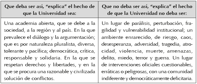 Primero, un esquema de comprensión según el cual pueden existir ''al menos dos universidades'' en una sola (Consejo Académico UdeA, 2010, septiembre 27). Una universidad ''pública e identificada'', que es ''vitalidad crítica'', ''efervescencia cultural'', ''amabilidad arquitectónica y paisajística'', ''centro de ciencia y cultura de Antioquia'', ''podio para el ascenso personal y esperanza de emancipación intelectual y económica de los jóvenes''; un lugar en el que miles de personas conviven ''sin mayores problemas y sin más vigilancia que las reglas implícitas de la convivencia civilizada''. Pero esta universidad coexiste con otra, diferenciable y paralela, ''espuria, privada, anónima, sin identificación''; de ''territorios conquistados a la fuerza'' -pupitres, corredores y zonas comunes-, ''chazas para ventorrillos'' y espacios ''para el narcotráfico''. Estas universidades configuran un orden universitario dual cuyos rasgos son también interpretables históricamente, pero otra vez conforme a valores. La protesta política, por ejemplo, característica de esa segunda universidad, sería ''protagonizada por avanzadillas de pequeños grupos cuyas actuaciones deslegitiman los ideales por los que protestan''; en la primera universidad, en cambio, las protestas coinciden con aquellas que en el pasado ''eran masivas, y tenían un alto grado de legitimidad y de apoyo, entre otras cosas, por la pulcritud de su moral revolucionaria'' (Consejo Académico UdeA, 2010, septiembre 27).