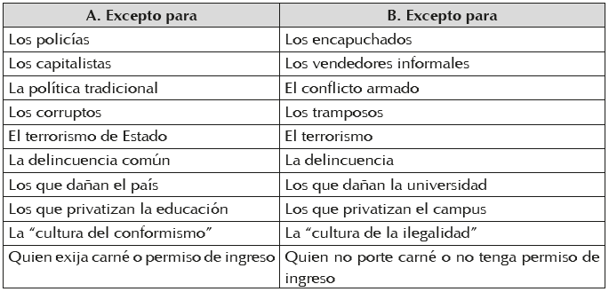 Pese a todo, todavía muchas personas permanecen voluntariamente en el campus en medio de los disturbios. Un comunicado de 2012 define unos hechos ocurridos en el campus como ''toma armada'', ''un acto a todas luces bélico'', ''sin motivo manifiesto alguno'' y que había generado ''en nuestra comunidad sensación de estar siendo víctima de un secuestro masivo''; pero a renglón seguido, lamenta que miembros de la comunidad, ''con un morbo irresponsable hacen de estos hechos unos espectáculos en los que se vocifera, se aplaude'' (Consejo de Facultad A, 2012, abril 19). Es comprensible que los mismos autores del comunicado expresaran ''sorpresa e incomprensión''. A cualquier lector externo a la Universidad también le puede parecer incomprensible que un acto de guerra descrito de aquella manera o un ''secuestro masivo'' fuera aplaudido por quienes los padecían. Como se ha dicho, la precisión sobre lo que ocurre tanto como el significado unánime de lo que se define no pueden darse por descontados. Es una de las propiedades de esa cosa cierta pero extraña y maleable que es la (in)seguridad.
