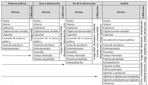 Esas y otras preguntas redimensionaron el problema originalmente planteado, obligando a precisardóndeocurrían los hechos de inseguridad. Localizar el lugar es importante por muchas razones: el peso y las diferencias del entorno urbano y social, la relevancia del contexto histórico y político, los imaginarios del lugar y sobre el lugar, entre otros. Sin saberdóndeocurren los hechos sería inexplicable, por ejemplo, la diferencia que muchos universitarios establecen entre un grupo de encapuchados transitando por su barrio y un grupo de encapuchados transitando por la plazoleta central del campus, entre una videocámara en la entrada de la Universidad y una videocámara en la entrada de un supermercado, entre un policía apostado en su cuadrante y un policía merodeando las aulas de clase.