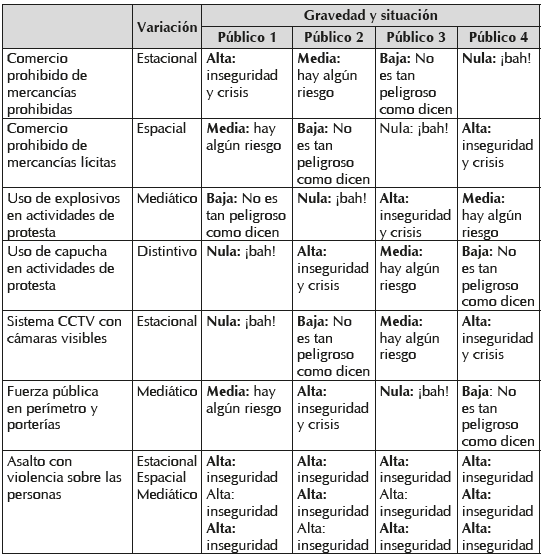 Cada evento puede ser examinado con todos los factores indicados o pueden establecerse relaciones entre los factores.10Por su parte, los ''públicos'' en el recuadro no se corresponden con un sector, estamento o gremio. Un público solo es clasificado -como 1, 2, 3 o 4- conforme a la percepción o definición que se detecta convergente.El análisis no pretende cuantificar ''tendencias'' en poblaciones previamente rotuladas. Los hechos que aparecen en el recuadro son apenas ejemplos utilizados para la ilustración de cómo puede proceder, según la interpretación de las fuentes, la definición de situaciones, pero no indican intensidad ni frecuencia objetivas.