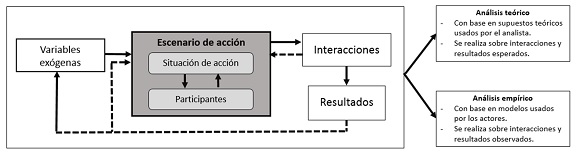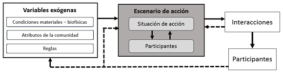 La Gráfica 1 muestra los principales elementos de un escenario de acción. Sobre la izquierda se pueden observar las «variables exógenas»: «condiciones materiales o biofísicas», los «atributos de la comunidad» y las «reglas» que influyen sobre el escenario de acción. Dentro del escenario de acción se encuentran la «situación de acción» y los «participantes» de dicha situación. La gráfica enfatiza el escenario de acción ya que es allí donde se focaliza el análisis. A la derecha se encuentran las «interacciones» y los «resultados» que son producto del escenario de acción, y que también repercuten sobre el escenario de acción mismo. Estas interacciones generan resultados que posteriormente pueden generar cambios en las variables exógenas y en el escenario de acción.