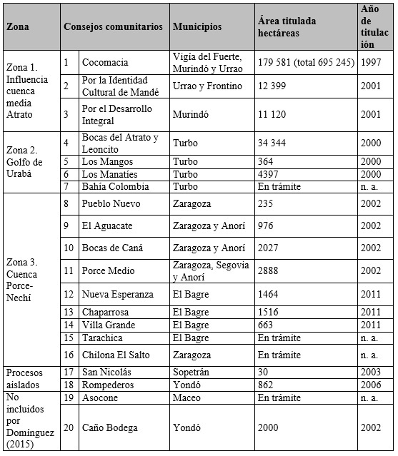 El panorama actual de las comunidades negras rurales en Antioquia es positivo. Esto se expresa en la conformación de un gran número de consejos comunitarios (CC),2 forma organizativa propia de este grupo étnico. La base de datos de la Dirección de Asuntos para Comunidades Negras, Afrocolombianas, Raizales y Palenqueras del Ministerio del Interior3 reporta dieciséis CC en Antioquia en 2015; a su vez, Marta Domínguez (2015, p. 108) registra la existencia de dieciocho CC en el Departamento, de los cuales catorce cuentan con títulos colectivos otorgados por el Instituto Colombiano de Desarrollo Rural (Incoder)4 entre 1997 y 2015. Se trata de más de 240 mil hectáreas en once municipios de seis subregiones de Antioquia. Domínguez (2015) identifica, además, tres zonas de fuerte presencia: la cuenca media del río Atrato, el golfo de Urabá y la cuenca del río Porce-Nechí en el Bajo Cauca; además, señala la existencia de dos procesos aislados en Yondó y Sopetrán.