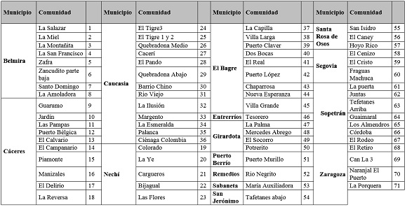 El trabajo de campo se realizó en las jurisdicciones de los consejos comunitarios de los municipios de Segovia, Zaragoza, el Bagre, Caucasia y Nechí en las subregiones del Nordesde y Bajo Cauca Antioqueños; en el Magdalena Medio se visitaron los consejos comunitarios de Puerto Berrío y Yondó; finalmente, en el Norte y Occidente antioqueño se adelantaron actividades con las comunidades negras de Belmira, Santa Rosa de Osos, San Jerónimo y Sopetrán. Todo esto se enmarcó en las actividades de atención y fortalecimiento de las comunidades negras por parte de Corantioquia.