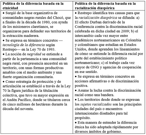 Esta idea ha sido postulada por Eduardo Restrepo (2013a), que muestra la transformación en la manera de entender y articular a las comunidades negras o negridad en la sociedad colombiana, y utiliza la noción de formación nacional de alteridad definida como el proceso de articulación de la diferencia racial y cultural, específicamente de las comunidades negras, en el contexto colombiano (p. 149). Desde allí describe el inicio de la incorporación de la negridad a la nación colombiana a principios de la década de 1990, según las formalidades y nociones propias de la nueva Constitución Política. En efecto, la Ley 70 se derivó del artículo transitorio 55, que señalaba un plazo de dos años a partir de la entrada en vigencia de la nueva Constitución para que el Congreso expidiera una ley que reconociera una serie de derechos especiales a las comunidades negras del país, y su formulación estuvo marcada por una política de la diferencia basada en la etnicidad. Según Restrepo, esta orientación viene siendo sustituida por otra concepción que él nombra como racialización diaspórica.