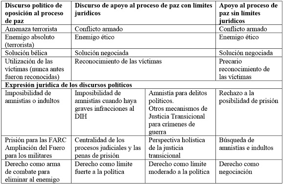 En esta sección se da cuenta de los diversos discursos en disputa que han emergido en los últimos años sobre el proceso de paz y los mecanismos institucionales que, de acuerdo con tales discursos, deben diseñarse, ya sea para lograr la paz o para procurar proteger los derechos de las víctimas del conflicto armado. En tal sentido, se tienen en cuenta aquellas perspectivas que resultan más visibles en el escenario político nacional, así como aquellas que más inciden en la Mesa de Conversaciones de La Habana. En primer lugar, los sectores de derecha más radical insistieron durante varios años en negar la posibilidad de diálogo con los grupos subversivos; en segundo lugar, se podía encontrar un archipiélago amplio de posturas en favor del proceso de paz, pero que igualmente reconocieron en mayor o menor medida la existencia de límites jurídicos a las negociaciones políticas. Entre quienes respaldaban estas perspectivas se encontraban múltiples sectores institucionales y sociales como el Gobierno, la comunidad internacional y muchos grupos de la sociedad civil. Finalmente, las FARC insistieron en fortalecer su percepción social como actor político que merecía amnistías generosas, participación política y la posibilidad de promover un nuevo pacto fundacional a través de una Asamblea Nacional Constituyente.