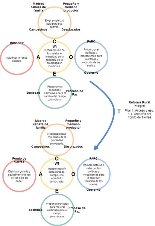 Para conocer detalladamente la situación problema y los subsistemas involucrados, se realizó un CATWOE, en el cual se determinan los clientes, los actores, la visión global, los dueños, el ambiente. Esta identificación se realiza antes y después de la transformación con la creación del Fondo de Tierras para la Paz según el borrador de la Reforma Rural Integral (véase Gráfica 1) (Gobierno de Colombia y FARC, 2014).