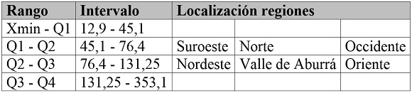 En la Tabla 1 se muestra el método de calificación implementado, derivado de la clasificación de las regiones dentro de los rangos del Box-Plot de los datos recolectados para cada criterio, en el caso del factor homicidio. Los datos corresponden a la tasa de homicidios por cada cien mil habitantes en el periodo 1990-2012 (Observatorio de la Consejería Presidencial para los Derechos Humanos, 2015).