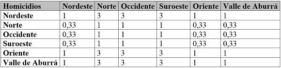 Con base en la anterior categorización se realizó un comparativo con la escala Saaty. Para esta valoración pareada se utilizó una variación en la escala Saaty tradicional, ya que no cuenta con valoraciones superiores a 7 —escala tradicional 1 a 9—, pues se considera que otorgar una preferencia extrema ameritaría un análisis detallado realizado por expertos en el tema, dado que se presume que puede existir una relación entre la presencia de otros grupos armados, que excede el propósito de este trabajo. Finalmente, una vez obtenida la valoración de todas las regiones respecto a cada factor, se procedió a realizar la valoración pareada de los factores (véase Tabla 2), en la cual se define que no existe preferencia alguna, pues todos estos actos constituyen crímenes de lesa humanidad y en algunos casos crímenes de guerra.