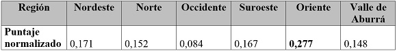 Luego de realizar un análisis similar para los demás factores, se procedió a construir los procedimientos de normalización y emparejamiento de la metodología para obtener la clasificación final y evidenciar que la región más impactada por este tipo de crímenes es el Oriente antioqueño, que obtuvo el mayor puntaje (véase Tabla 3).