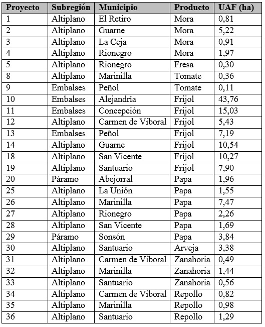 En la Tabla 4 se presenta información sobre algunos de los 36 proyectos ejecutables en el programa de asignación, los datos correspondientes a las UAF fueron suministrados por la Secretaria de Agricultura de Antioquia (Incoder-Corantioquia, 2013).