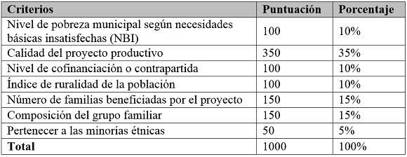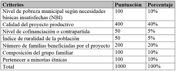 Adicionalmente, dado el gran número de proyectos que tiene este programa, junto con la restricción de que la tierra es un recurso limitado, se hace necesario priorizar algunos proyectos. En la actualidad, esta tarea se hace mediante la valoración de siete criterios, los cuales se presentan en la Tabla 5, a partir de la información obtenida en el programa de reubicación. El peso de cada uno de ellos varía dependiendo de la convocatoria, algunas favorecen a personas en condición de desplazamiento o víctimas del conflicto armado, entre otros (J. J. Contreras Alzate, Programa de Reubicación, comunicación personal, marzo 7, 2016).