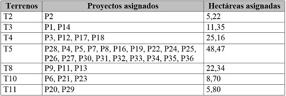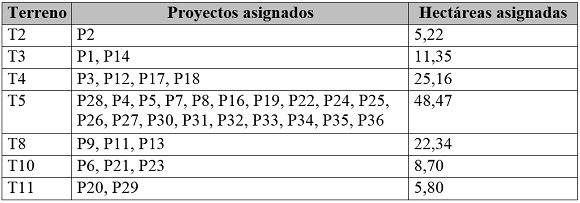 En la Tabla 6 se presentan los resultados de la asignación de terrenos y se aprecia que de la totalidad de proyectos dos no fueron asignados, dado que el Fondo de Tierras para la Paz no cuenta con la capacidad total de hectáreas requeridas. Para lograr el mayor beneficio, la solución sugiere descartar los dos proyectos con mayor exigencia de hectáreas. Igualmente, según lo planteado en el modelo se respetó la restricción relacionada con la capacidad máxima de los terrenos.