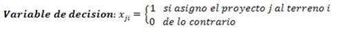Por otra parte, se cuenta con n terrenos donde cada uno tiene una cantidad máxima de hectáreas disponibles di, estos serán asignados según la cantidad requerida por cada proyecto hj y la vocación del suelo. Para esto se creó un parámetro con la pertinencia de los terrenos asignables a cada proyecto qij, los cuales se clasificarán según atributos considerados por los expertos. El objetivo del problema es, entonces, encontrar una solución que maximice el beneficio del programa de asignación de terrenos, manteniendo una priorización de los proyectos y la pertinencia de los terrenos.