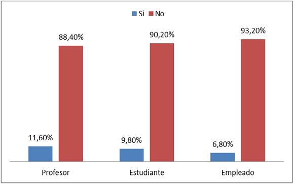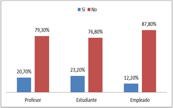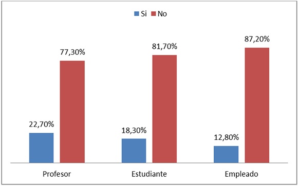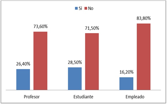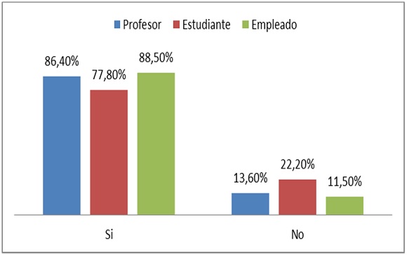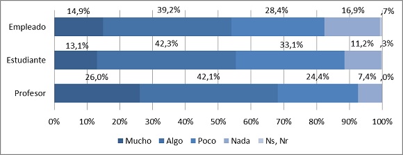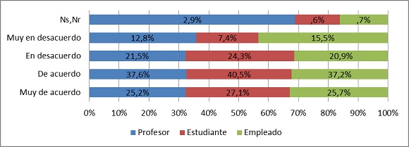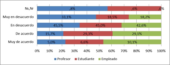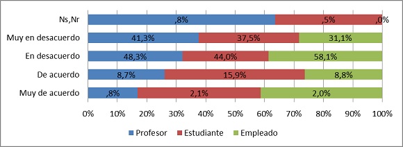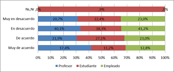 En segundo lugar, la Universidad —además de ser un espacio que posibilita la conversación política— es percibida como una institución con vocación pluralista y democrática: 72% de los universitarios está de acuerdo y muy de acuerdo con que en la Universidad las personas son capaces de escuchar a otras con ideas distintas a las suyas (profesores 57%, estudiantes 79%, empleados administrativos 66%); 59% cree que en la Universidad se respetan los derechos de otras personas (profesores 48%, estudiantes 66%, empleados administrativos 49%); 56% considera que los universitarios se interesan en conocer acerca de las tareas que el Gobierno realiza (profesores 44%, estudiantes 63%, empleados administrativos 47%); y 42% afirma que en la Universidad se respeta la ley (profesores 39%, estudiantes 44%, empleados administrativos 33%). En todos los casos los estudiantes resultan ser quienes más valoran estos aspectos de la Universidad, pues siempre están por encima del promedio general y superan a los otros estamentos.15