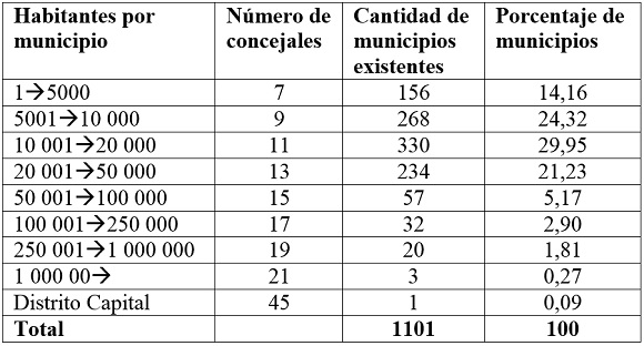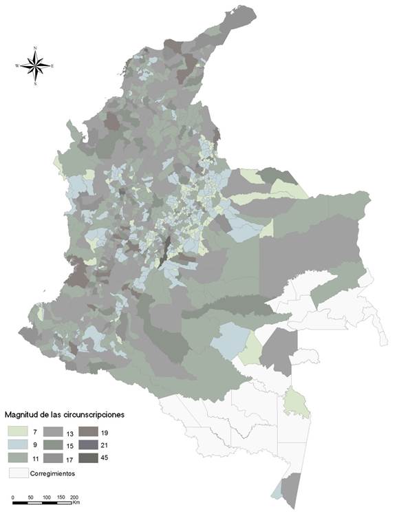 Los distritos electorales configuran en el país una geografía electoral en donde priman circunscripciones de municipios menores de 50 000 habitantes, de manera que en el 89,66% de estas entidades territoriales se eligen entre 7 y 13 concejales. Los municipios de entre 10 001 y 20 000 habitantes, con una magnitud de 11 representantes, agrupan prácticamente el 30% del total. Como puede verse en el Mapa 1, los municipios en esta categoría están distribuidos por todo el país, mientras que los más pequeños, que no superan los 10 000 habitantes, con circunscripciones de 7 y 9 concejales tienden a concentrarse en los departamentos de Cundinamarca, Boyacá y Santander.