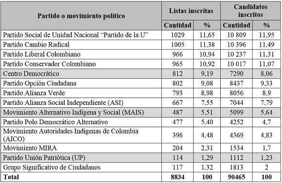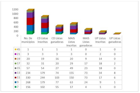 Específicamente en lo relacionado con la presentación de candidatos a Concejos, el máximo posible de listas a presentar era de 1101, situación que ninguno de los partidos en competencia alcanzó. Al respecto, y como se observa en la Tabla 2, el CD inscribió 812 listas, 9,19% de las inscritas en el país, mientras que MAIS inscribió 487 (5,51%) y la UP tan solo 114 (1,29%).