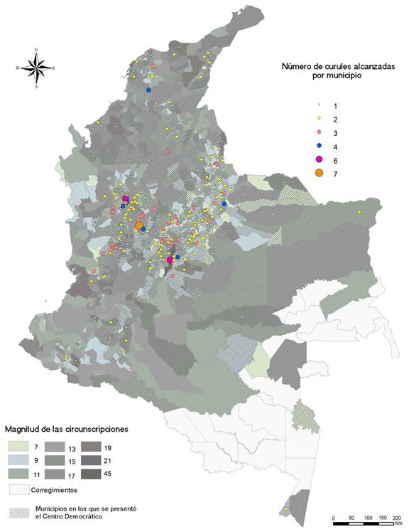 De otro lado, la cantidad de concejales conseguidos por los tres partidos, según la circunscripción, ha contribuido a la configuración de una nueva geografía electoral en el país. En la mayoría de las circunscripciones de magnitud 7 y 9, en donde el CD tuvo listas ganadoras, consiguió entre una y dos curules en los respectivos concejos municipales. La mayor representación la consiguió en Pensilvania (Caldas) una circunscripción de magnitud 13 en donde obtuvo 7 concejales, mientras que, en Bogotá y Medellín, alcanzó 6 en cada ciudad. De esta manera, el CD, a pesar de ser un partido nuevo en el juego político, aseguró su presencia prácticamente en todos los municipios del Centro y Oriente del país (véase Mapa 2).