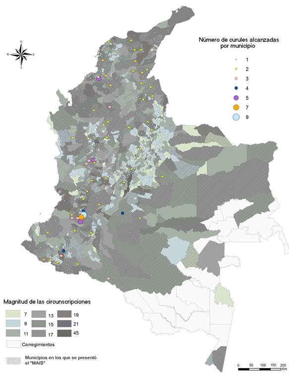Los resultados obtenidos por el MAIS, como se ve en el Mapa 3, también presentan sus particularidades. Obtuvo la mayoría de sus curules en circunscripciones de tamaño 11 y 13, por lo general con uno o dos concejales, logrando presencia en gran parte del país, pero con una marcada concentración en el departamento del Cauca, en donde consiguió más del 60% de las curules en municipios como Jambaló y Toribío. Este hecho se corresponde, en términos territoriales y electorales, con las características de MAIS como organización que busca la representación de minorías étnicas.
