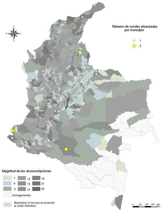La UP, por su parte, obtuvo 17 curules en todo el país, la mayoría en circunscripciones de magnitud 11 y 13, con apenas 1 concejal y excepcionalmente con 2 en los municipios de Cartagena del Chaira (Caquetá), Francisco Pizarro (Nariño) y San Calixto (Norte de Santander) (véase Mapa 4).