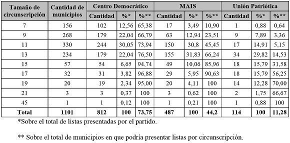 — Los tres partidos inscribieron listas en todos los tamaños de circunscripciones, pero su presencia en ellos fue diferenciada. Mientras el CD logró cubrir el 73,7% de los Concejos del país mediante la inscripción de listas, la UP solo lo hizo en el 11,2% de circunscripciones. Por su parte, MAIS, pese al carácter de grupo minoritario en el Congreso, logró organizar listas para postular en un 44,2% de estas corporaciones.