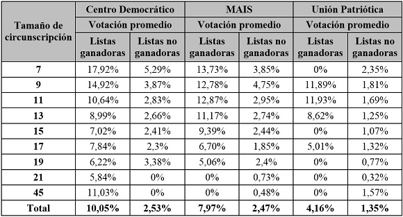 La tendencia descrita, que confirmaría la hipótesis planteada inicialmente, no se corrobora en los otros dos partidos estudiados. Ninguno de ellos consiguió curules en las circunscripciones de mayor tamaño —magnitud 45 y 21—, donde en teoría podrían tener más juego político. En las cuatro grandes ciudades las aspiraciones de estas dos agrupaciones se vieron del todo frustradas al no conseguir ninguna lista ganadora. Adicionalmente, la UP tampoco logró tener éxito con ninguna de las listas que postuló a circunscripciones de magnitud 19, 15 y 7.