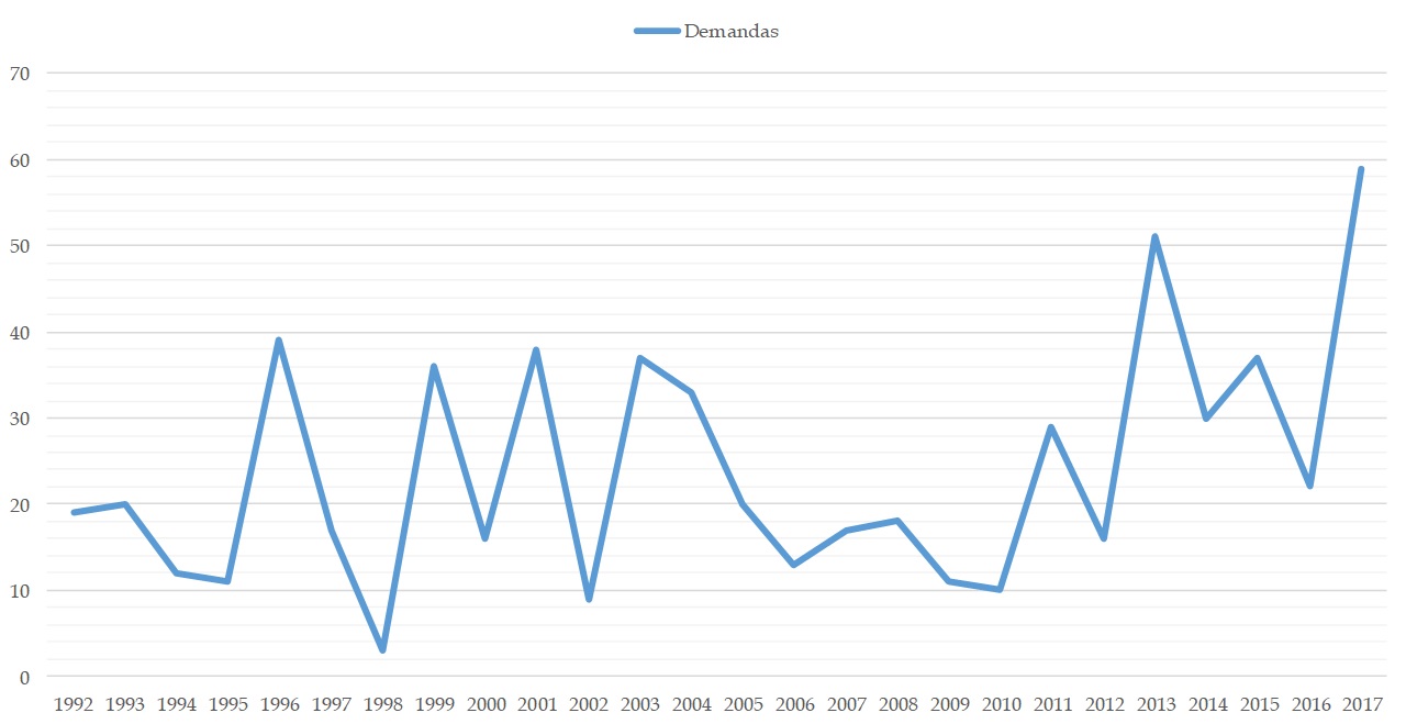 Sobre 37 leyes tributarias expedidas entre 1989 y 2016 los colombianos han presentado 623 acciones públicas de constitucionalidad. Los picos (1996, 1999, 2001, 2003, 2011, 2015 y 2017) obedecen a que el año inmediatamente anterior se promulgó una reforma estructural.1 Aunque no se observa ninguna tendencia clara, sí llama la atención el alto número de demandas que se presentaron en 2017. Una posible interpretación es que la reforma que se hizo el año anterior tuvo un alto grado de visibilidad pública gracias, en buena parte, a que el desescalamiento del conflicto con las FARC ha permitido abrir la agenda a nuevas temáticas.