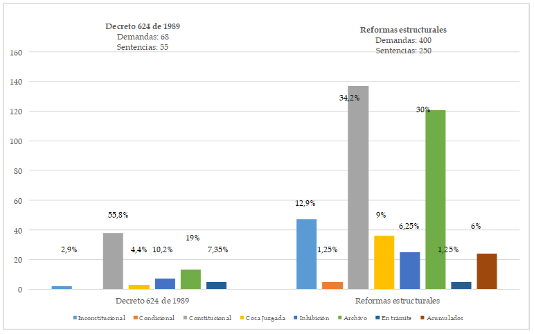 Al hacer una comparación entre las demandas al Estatuto Tributario (ET) y las demandas a sus principales reformas, la efectividad de las acciones en contra de estas últimas es mucho mayor. Mientras que tan solo 2,9% de las demandas al ET terminan en una sentencia favorable —de inexequibilidad—, cerca de 13% de las demandas a las reformas consiguen que los artículos demandados salgan del ordenamiento jurídico. Es decir, parece ser más probable destruir artículos de las reformas que del ET. Sin embargo, hay que resaltar el alto nivel de archivo que se generan frente a estas acciones (30%). La decisión de archivo se produce cuando, después de presentada la demanda, la Corte Constitucional encuentra que tiene vicios que no permiten su análisis. Se da un plazo para que esos vicios se corrijan, y si no se logra se archiva. Al tratarse de temas muy técnicos, puede ser particularmente difícil para la ciudadanía estructurar demandas que se ajusten a los requerimientos mínimos que exige la jurisdicción constitucional, y puede ser por esto que se produce tan elevado porcentaje de archivo.