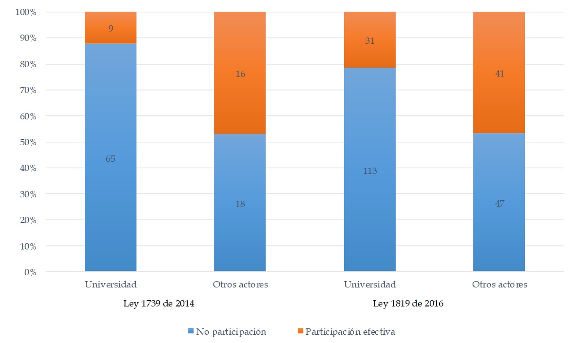 En el caso de la Ley 1739, las universidades recibieron 74 invitaciones a participar en los diferentes procesos; sin embargo, solo en 9 oportunidades se envió un concepto técnico. En cuanto a la Ley 1819, de las 144 invitaciones las universidades solo participaron en 31 oportunidades. La voz de los actores más calificados ha sido débil. Al tratarse de un tema que requiere de conocimientos técnicos precisos que van más allá de lo jurídico y que pasan por lo político y económico, los magistrados de la Corte Constitucional —abogados de formación—, buscan constante apoyo en entidades cuyo conocimiento técnico es reconocido en el ámbito nacional. A pesar de esto, ese aporte ha sido tenue. Si se asume que el proceso de revisión de la constitucionalidad de las normas tributarias está atravesado por el objetivo de lograr que la configuración de la capacidad fiscal del Estado se ajuste a criterios de conveniencia técnica y política, el inconsistente apoyo de la academia no le ha aportado a ese equilibrio.