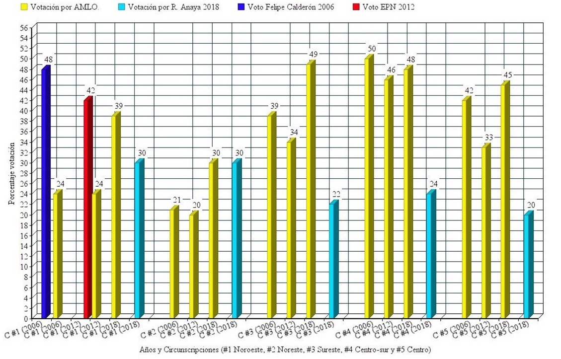 En síntesis, el análisis de las circunscripciones evidencia que para la elección de 2018 AMLO creció en todas las circunscripciones, siendo este equilibrio territorial el principal cambio frente a otras elecciones. En la C#1 penetró por primera vez; en la C#2 debilitó al PAN; en la C#3 recuperó su credibilidad; en la C#4 se estableció su bastión; y en la C#5 fluctuó entre apoyarlo o darle la espalda. Quitando el difícilmente reproducible «efecto Peña Nieto» —en las C#5 y C#3—, en los comicios de 2018 se rompió la impenetrabilidad en las C#1 y C#2, y es posible pensar en estas regiones como swing states a la mexicana, es decir, son zonas con una volatilidad elevada del voto: apoyaron al PAN en 2006, al PRI en 2012 y a Morena en 2018.
