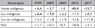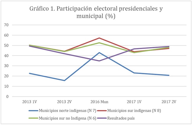 Respecto a las comunas con alta población indígena, tanto en el norte como en el sur la asistencia a votar se incrementó en las elecciones de 2005 y 2009. Para 2013 y 2017, una vez que implementado el voto voluntario, las tendencias son exactamente opuestas entre las comunas indígenas del norte y las del sur. En el sur fue positiva en las de 2013 y en el norte fue positiva en las elecciones de 2017. En las comunas de control para la zona sur tienen un comportamiento más similar a la situación general del país para 2005-2009, aunque allí se manifiesta una tendencia de aumento de menor participación, que lo ratifica que al menos en las comunas indígenas del sur se da un comportamiento diferenciado.