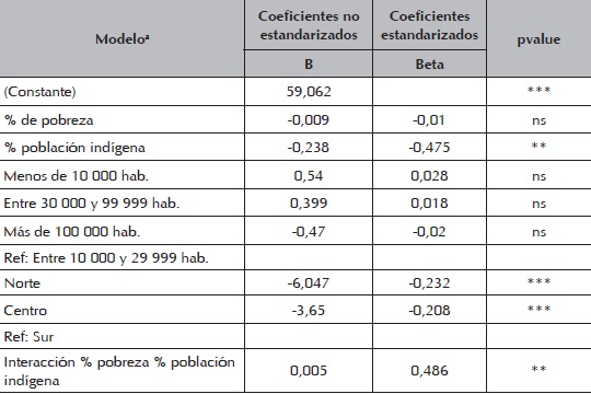 Asimismo, se confirma que, a nivel general, mayor proporción de población indígena muestra menor participación electoral. Sin embargo, algo que se ha discutido menos en la literatura, ni se había planteado como hipótesis a testear y que resulta del modelo analizado es que en casos de comunas donde interactúan el alto nivel de pobreza y alto porcentaje de población indígena habría una tendencia a mayor participación (Miller et al., 1981), donde la autoconciencia de grupo y los altos niveles de pobreza movilizaban a los electores.11