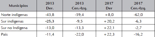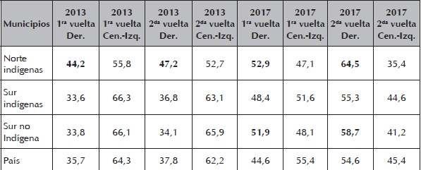 En las elecciones presidenciales chilenas de 2017 triunfó la coalición de derecha con 54,6%, mientras que la coalición de centro-izquierda obtuvo 45,4%. El hecho de que la derecha haya obtenido la más alta votación en la región de la Araucanía (62,4%) —donde se concentra el conflicto entre el Estado chileno y el pueblo Mapuche— inmediatamente llevó a asumir que los indígenas volvían a inclinarse por esa tendencia. Lo anterior parece contradecir estudios que han demostrado que no es posible inferir una preferencia de los indígenas por la derecha y que existen particularidades territoriales relevantes para considerar (Morales y González, 2011; Toro y Jaramillo, 2014).