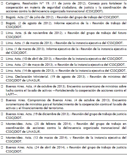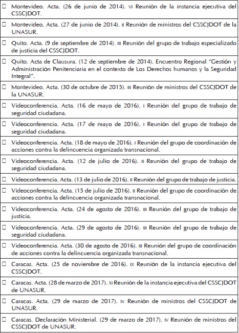 Our historical analysis is based on qualitative research of official documents (minutes, reports and releases) of the CSSCJDOT, provided by the Digital Repository site of UNASUR. In the research we collected 43 documents provided by the platform or through direct contact with UNASUR secretaries from July 2012 through March 2017. Among these documents, we found 34 fit for our analysis based on our research question (see Table 1). The analysis of the material was made through a qualitative method of content analysis, based on the conceptual framework of Peace Studies.