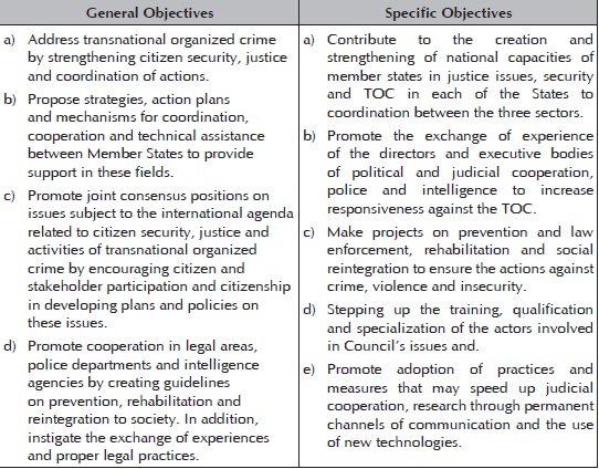 The meeting was also important to approve the statute of the Council, whose nature is reported as a permanent body of consultation, coordination and cooperation between Member States to combat TOC and for the promotion of justice and public security. These principles are in accordance with the constituent treaty of UNASUR and the UN Charter; unrestricted respect for sovereignty, self-determination, human rights and fundamental freedoms of citizens. Also among the principles are the promotion of social inclusion, civic participation and gender equality (Terra, 2012, maio 4). At that time general and specific objectives of the organization were established as well. This can be seen in Table 2.