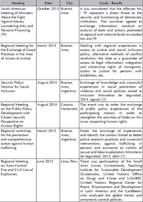 Among the meetings and seminars in compliance with the action plan of the CSSCJDOT, different themes were congregated, as can be seen in Table 3. The question is whether they will get diffusion in domestic public policies —which may be a relevant topic for researchers on the subject in the near future— or just isolated events without effectiveness for the regional cooperation against crime.