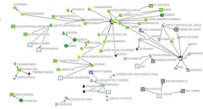 En esta investigación, el centro aparece conformado por las corporaciones autónomas regionales (CAR) y la periferia por un conjunto de organizaciones donde se destacan algunas de naturaleza civil, otras estatales y algunas de carácter gremial con intereses económicos muy puntuales —por ejemplo, Asociación de Cultivadores de Caña de Azúcar de Colombia (Asocaña), Asociación Nacional de Industriales (ANDI)—. La renta política, ambiental y económica parece inmersa en los vínculos de la red, aunque aparenta variar levemente con la coyuntura. Pero a la larga, lo que inquieta no es tanto la eventualidad de los vínculos y la forma de «estrella» que advierte alta concentración del poder, lo que preocupa es la poca conectividad de la periferia, incluso el bajo protagonismo de las innovaciones ambientales regionales —por ejemplo, Corporación Vallecaucana de las Cuencas Hidrográficas en el Medio Ambiente (Corpocuencas)— que desde la década de 1990 iban a ser llamadas a impulsar los engranajes multisectoriales. Esto, a la usanza de los «vínculos débiles», denominados así por Mark Granovetter (2005) en su exploración de la sociología económica y la teoría neoinstitucional.