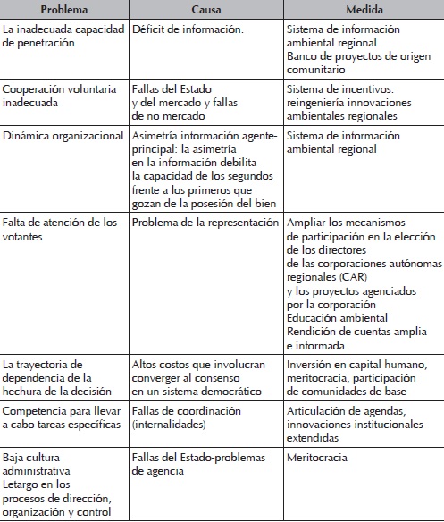 Sin embargo, en medio del asunto estarían instituciones ancladas en la historia, tales como la herencia colonial y hacendaria, las cuales, aparte de señalizar la estructura de usos del suelo y la dinámica del aprovechamiento del agua, pondrían la impronta a las formas en que se toman las decisiones de gestión ambiental, incluso, modificando los designios de una administración pública que bajo el nuevo modelo de desarrollo, orientado a resultados eficientes, aspiraba ser más plural y posburocrática. Asimismo, la Ley 99 de 1993, mediante su despliegue técnico-modernizador, busca combatir el fenómeno degradatorio mediante la aplicación de instrumentos económicos —costo-efectivos— como los impuestos pigouvianos2 y, de paso, disminuir la fuerza coercitiva de las herramientas de «comando y control» para ampliar el espacio de la participación comunitaria.