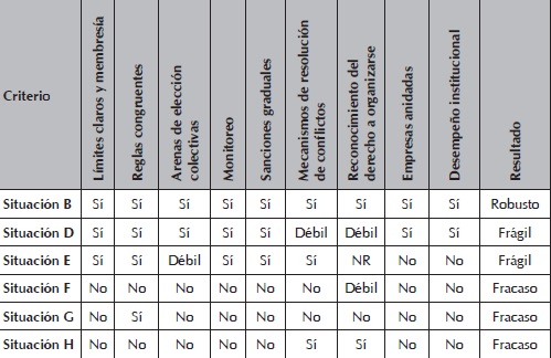 Por el lado de la gobernanza, los resultados no parecen ser robustos (Ostrom, 1999; Anderson y Ostrom, 2008). Para Elinor Ostrom la gobernanza policéntrica consiste en la existencia de múltiples centros que toman decisiones individualmente, los cuales están bajo lineamientos como: límites claros y membresía, reglas congruentes, áreas de decisión colectiva, monitoreo, sanciones graduales, mecanismos de resolución de conflictos, reconocimiento del derecho a organizarse, empresas anidadas y desempeño institucional, con lo cual, se espera que el resultado sea una gobernanza policéntrica robusta.