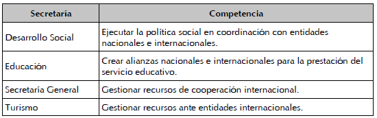 Asimismo, el Departamento estableció su estructura administrativa (Decreto 0227 de 2012) a partir de quince secretarías: Privada, Planeación, Hacienda, Salud, Educación, Agricultura y Pesca, General, Gobierno, Desarrollo Social, Movilidad, Turismo, Infraestructura, Servicios Públicos, Deporte y Cultura. Ello sin crear una dependencia de relaciones internacionales, aunque desde 2013 funciona la Oficina de Cooperación Internacional adscrita a la Secretaría de Planeación, la cual se encarga, según uno de sus funcionarios (comunicación personal, octubre 14, 2018), de canalizar las convocatorias de la Agencia Presidencial de Cooperación Internacional de Colombia (APC-Colombia). Adicionalmente, otras cuatro secretarías tienen funciones internacionales.