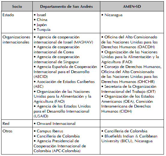 Protocolarmente, es notoria la continua relación con la Gobernación de Santander mediante el Primer Encuentro de Cooperación y Hermanamiento (Gobernación del Archipiélago, 2013, octubre 3), así como la recepción de autoridades extranjeras de las Embajadas de Gran Bretaña (Barraza, 2013, enero 17), Holanda y Corea del Sur (Barraza, 2014, septiembre 11) con fines de cortesía y búsqueda de inversiones. Por su parte, la dimensión de la cooperación internacional al desarrollo posicionó al archipiélago como beneficiario de asistencia técnica y como participante en capacitaciones y seminarios internacionales con el fin de mejorar la prestación de los servicios públicos, el cuidado del medio ambiente y la productividad, siendo fundamental el rol de las agencias de cooperación internacional de los países desarrollados.