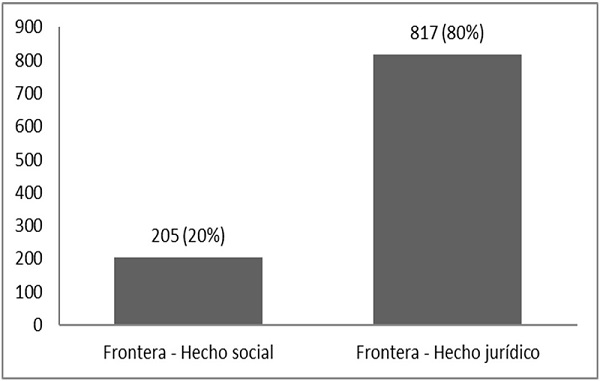 Esta apreciación queda de manifiesto al medir las ocurrencias de las categorías temáticas en la prensa nacional. Como se observa en la Gráfica 1, de las 1022 veces en que estos diarios hacen alusión a la frontera como «Hecho Social» o «Hecho Jurídico», 817 veces (80%) lo hacen refiriéndose a hechos puramente jurídicos -a los hitos, al Punto Concordia, al Tratado de 1929, a los tratados de 1952 y 1954, a la Corte Internacional de Justicia, entre otros-, sin considerar el espacio geográfico, la historia del territorio ni a la población que lo habita. Y solo 205 veces (20%) los medios nacionales establecen una relación entre la frontera y conceptos que dan cuenta de un espacio de sociabilidad, que se habita y transita, y en el que se producen intercambios, comercio, diálogos, encuentros y también fricciones.
