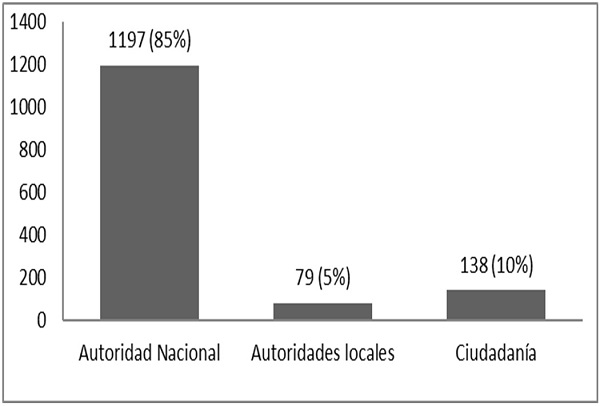 Al objetivar los datos, contando las ocurrencias de los sujetos lógicos -actores-, de las 1414 veces que los medios nacionales dan voz a algún actor para que se refiera a la frontera, 1197 veces (85%) la voz pertenece a una autoridad del Gobierno central, 79 veces (5%) a una autoridad local y 138 veces (10%) a la ciudadanía -diversos actores de la sociedad civil-.