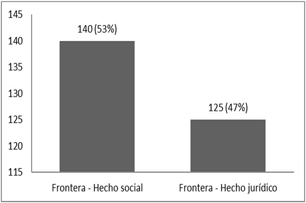 Al hacer el ejercicio de contar las coocurrencias de las categorías temáticas en la prensa local, se observa con toda claridad el contraste con lo que sucede en los medios nacionales. En este caso, las menciones a la frontera están más relacionadas con «Hechos Sociales» que con «Hechos Jurídicos». De las 265 veces en que estos medios se refieren a tales categorías, 140 veces (53%) lo hacen aludiendo a algún «hecho social», es decir, a conceptos como intercambio, comercio, encuentro, diálogo, integración y otros similares que denotan relaciones humanas y que «construyen» la frontera como un espacio de sociabilidad. En tanto, 125 veces (47%) lo hacen refiriéndose a la categoría «Hecho Jurídico», esto es, a los tratados de 1929, 1952, 1954, al Hito 1, al Punto Concordia, entre otros.