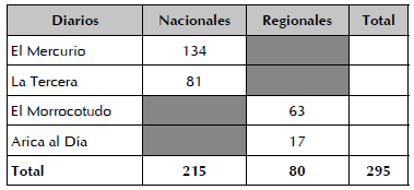 Como resultado, se obtuvieron 134 noticias de El Mercurio, 81 de La Tercera, 63 de El Morrocotudo y 17 de Arica al Día. La diferencia entre la cantidad de noticias encontradas y seleccionadas en los diarios nacionales y regionales -215 frente a 80- se debe al menor número de noticias publicadas y almacenadas en los sitios web de estos últimos, y a la menor precisión de sus motores de búsqueda.