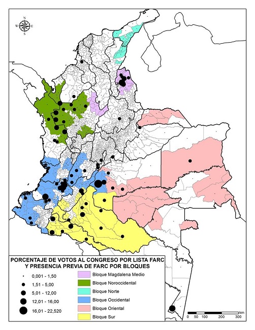 Un asunto que merece atención en el caso colombiano es si la influencia histórica y armada que ejerció el grupo rebelde sobre un territorio se traduce en apoyo electoral cuando se posibilita su participación política (Dudouet, Planta y Glessmann, 2016). Tal hallazgo es controvertible cuando se contrasta la presencia de los bloques armados de las FARC-EP en el ámbito municipal con los resultados de la votación que obtuvo su partido en las elecciones al Congreso. En este sentido, el Mapa 1 permite evidenciar cómo, aunque la votación de la FARC se registró principalmente en escenarios donde tenía presencia previa, tal condición no aseguró la fidelidad de los votantes, teniendo en cuenta la correspondencia entre las variables de presencia armada previa y porcentaje de votos.