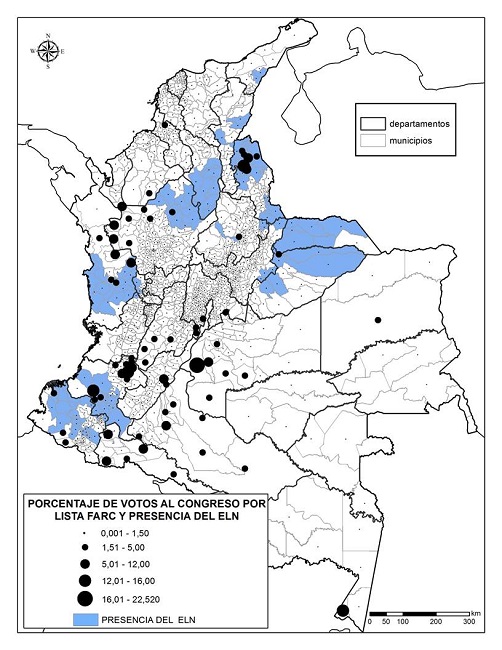 Para empezar, el Mapa 2 permite identificar los municipios en los que el ELN ha mantenido una presencia activa y su correspondencia con los escenarios en los que el partido FARC obtuvo diferentes niveles de votación. En el ámbito nacional se evidencia que, de los 119 municipios con influencia de esta guerrilla, 107 registraron votos por el nuevo partido, es decir, 89% de correspondencia. Sin embargo, lo que se observa en el ámbito subnacional es que hay dos escenarios distintos. Mientras que, por un lado, se registran varias zonas de influencia del ELN —Catatumbo, Nariño, Cauca y Chocó— donde el partido FARC logró apoyo electoral y la persistencia de la guerrilla del ELN no configuró un obstáculo para la obtención de votos, de otro lado, en departamentos como Arauca y Casanare, así como en zonas del Bajo Cauca antioqueño y el Sur de Bolívar es evidente la presencia del ELN y una votación nula o escasa por el partido FARC.