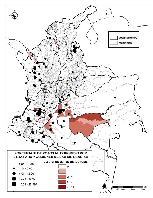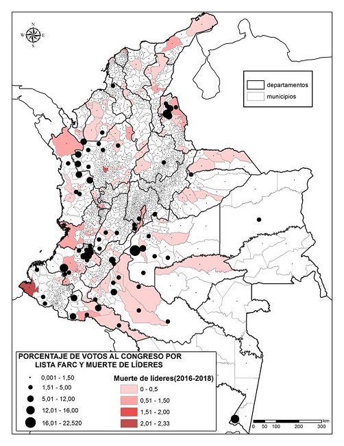 Abstract: This article examines the achievements and challenges of the political participation of the Common Alternative Revolutionary Force (FARC) in the context of the electoral dynamics and evolution of the armed conflict and violence. The reflection about the political participation of the FARC party at the national level is based on the contributions of specialized literature on political reincorporation, and on the 2018 Congress election results. Through the software ArcGis it analyzes the amount of votes obtained by the FARC in relation to decisive variables of the low or high electoral support, such as the presence of armed groups, criminal economies and the killings of leaders. By summarizing these elements, this research identifies various institutional and non-institutional factors that have influenced the political reincorporation of the FARC-EP. The analysis will underscore that, allthough political provisions for the transitory access of the FARC party to seats in the Congress were reasonable in order to achieve a negotiated solution to war, a low vote level for the new party reveals an uncertain future for its continuity in spite of electoral opportunities set by the Final Peace Agreement.