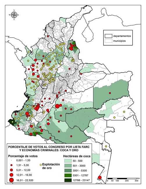 Además, con el software ArcGis 10.5 (ESRI, 2018) se adelantó una triangulación de información cualitativa y cuantitativa sobre presencia de grupos armados, economías criminales, muerte de líderes sociales y resultados electorales con el fin de facilitar el análisis sobre la correspondencia entre variables de interés —por ejemplo, la presencia de estructuras de las FARC-EP antes del Acuerdo final y porcentajes de votación por el partido FARC al Congreso— y examinar patrones espaciales clave para esta investigación —por ejemplo, la concentración de la votación por la FARC en zonas con cultivos de coca y minería de oro—.