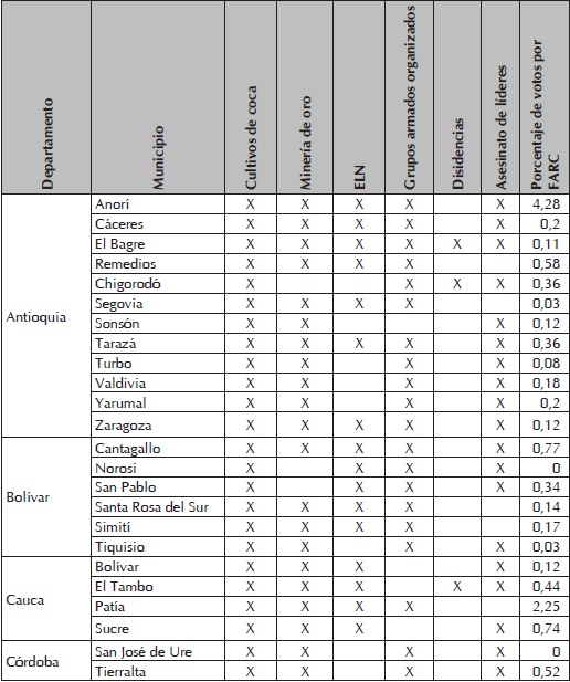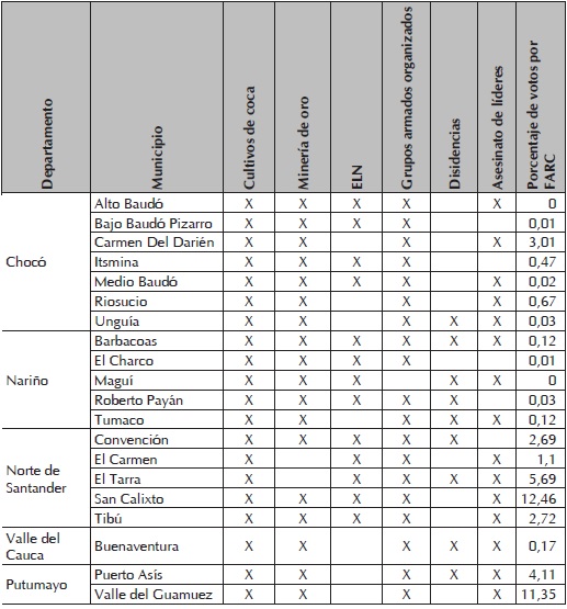 Por un lado, la mayor votación por la FARC se produjo por fuera de los escenarios de mayor producción de coca y de explotación para la minería de oro. De los 181 municipios que presentaron cultivos ilícitos y votación a favor la FARC, tan solo 6,7% registró un nivel de votación mayor a 5% por el partido de los excombatientes. Además, de los 146 municipios donde se adelantan actividades de minería de oro, tan solo Vigía del Fuerte, Antioquia, presentó una votación favorable a la FARC superior a 5%. Por el otro, los factores de riesgo incluyen criterios diversos como la institucionalidad electoral, la criminalidad electoral, factores de violencia, financiación de la política, acuerdo de paz, grupos de especial atención y comunicación (MOE, 2018).