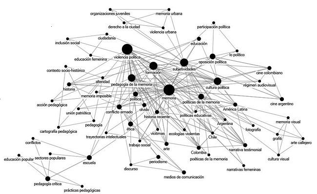 El análisis de la red también denota la importancia de la pedagogía de la memoria, que se vincula con la categoría de historia reciente, las cuales se despliegan en trabajos en los que se indaga sobre las políticas de la memoria y su expresión en los lineamientos y propuestas de enseñanza en torno al pasado reciente, por ello también se entrecruzan con la formación, la memoria y la violencia política. La historia reciente da cuenta de un enfoque historiográfico que, desde acercamientos interdisciplinares a los objetos de estudio, reivindica las memorias de los sujetos, pues se centra en las diferentes voces y huellas que dan cuenta de los efectos del pasado en el presente, al tiempo que se interpelan las memorias hegemónicas al posicionar en la esfera pública a sujetos excluidos de la historia oficial.